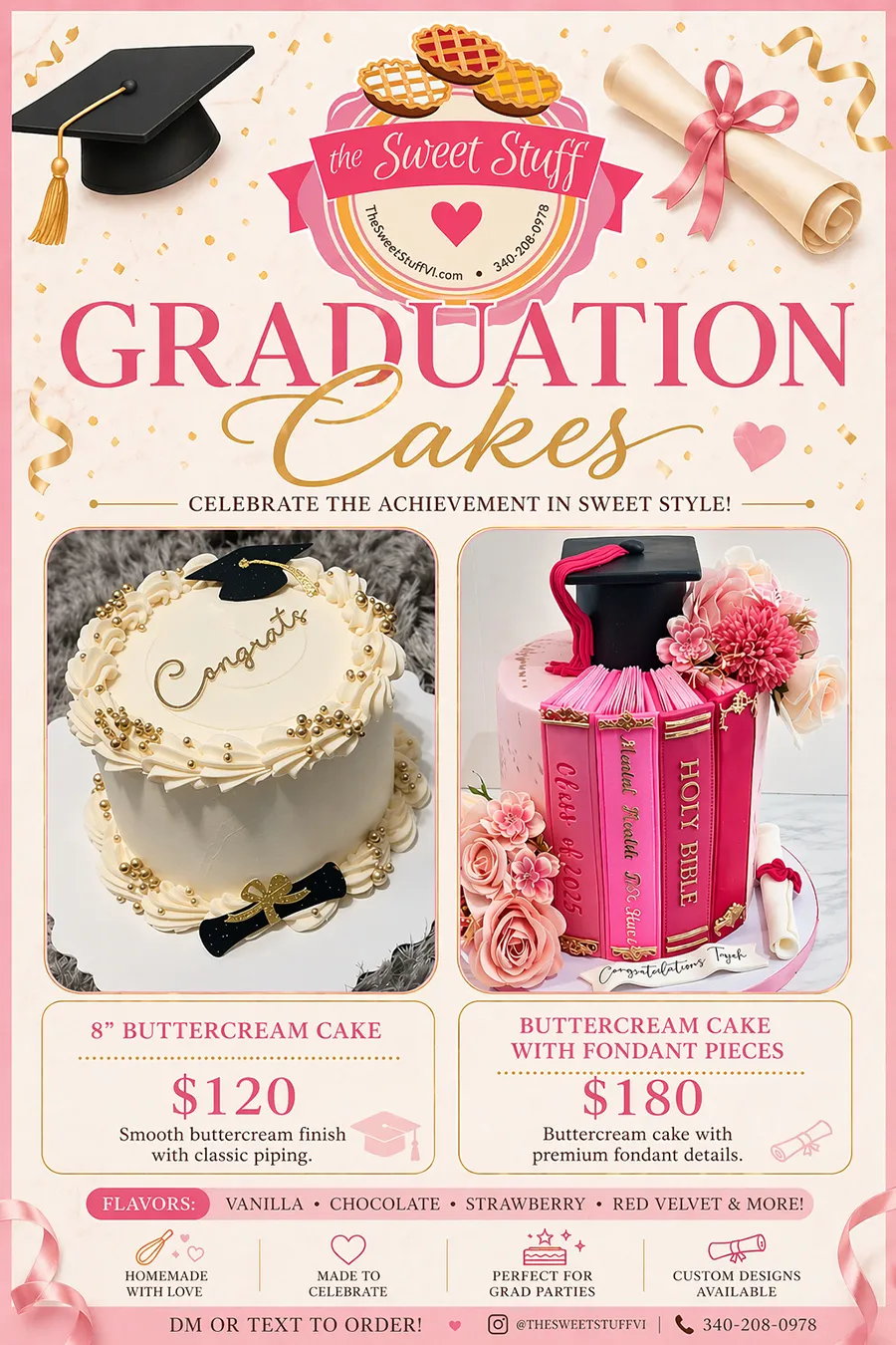 Celebrate the achievement in sweet style! Choose from an 8″ buttercream cake with classic piping or a buttercream cake with decorative fondant details.